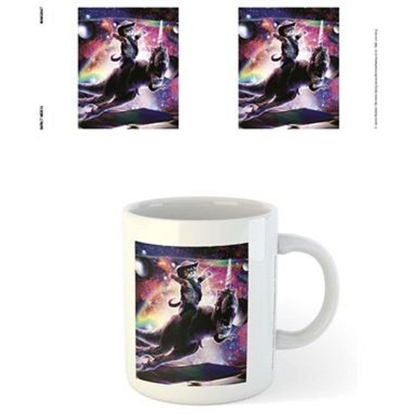 Standard style mug, featuring a humourous design of a cat wearing a hat, riding on a T.Rex Unicorn through space!